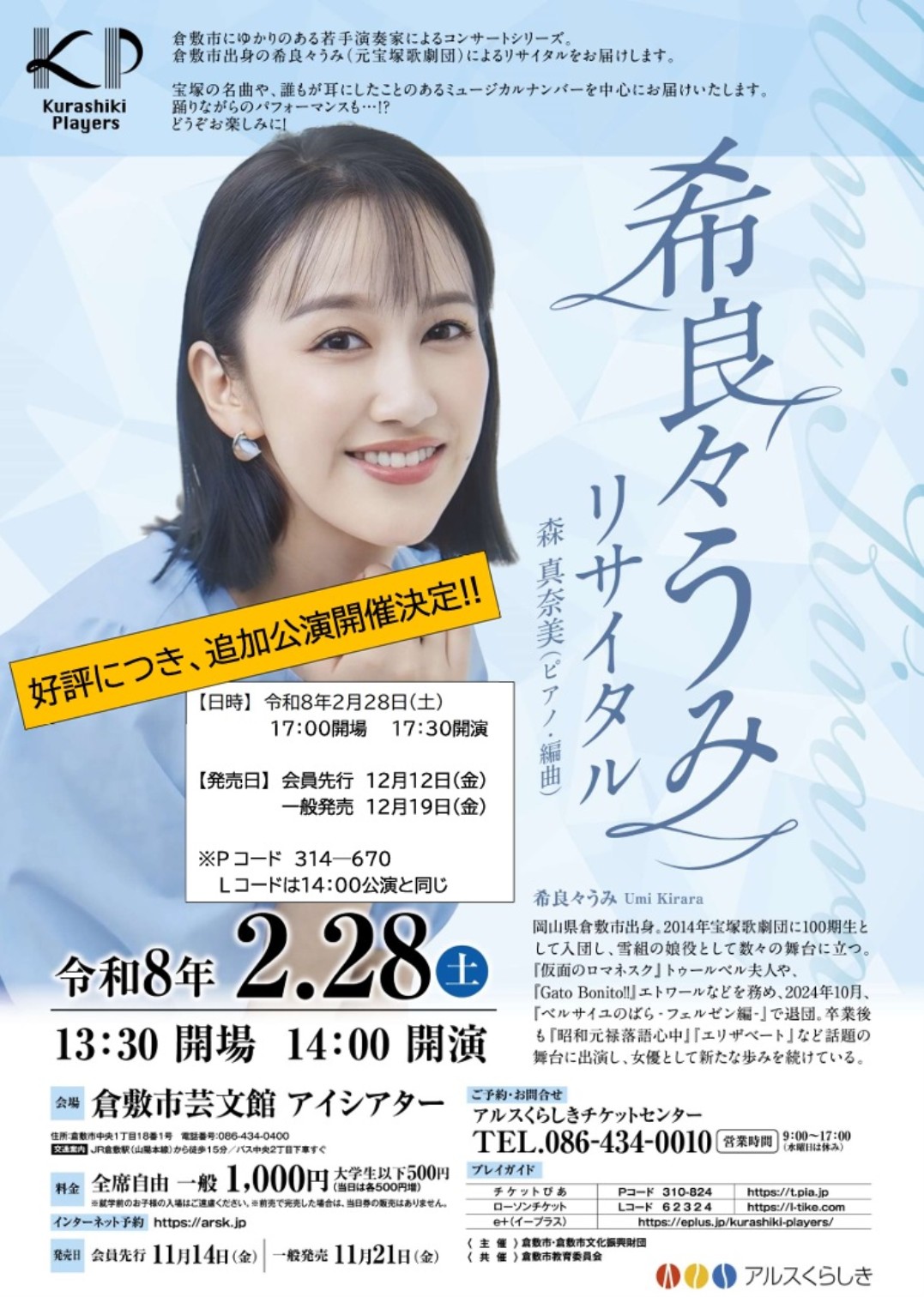 We will be presenting a recital by Kirara Umi (former member of the Takarazuka Revue) from Kurashiki City.