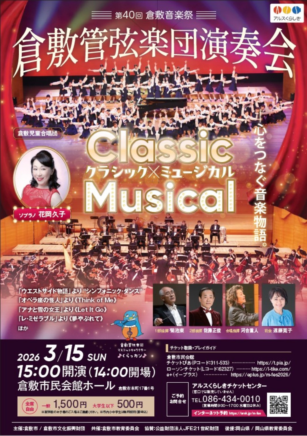 The first part will feature orchestral works such as symphonic dances from "West Side Story." The second part will feature "The Phantom of the Opera," "Cats," "Les Miserables," and "The Magic of Disney," performed in collaboration with the Kurashiki Children's Choir.