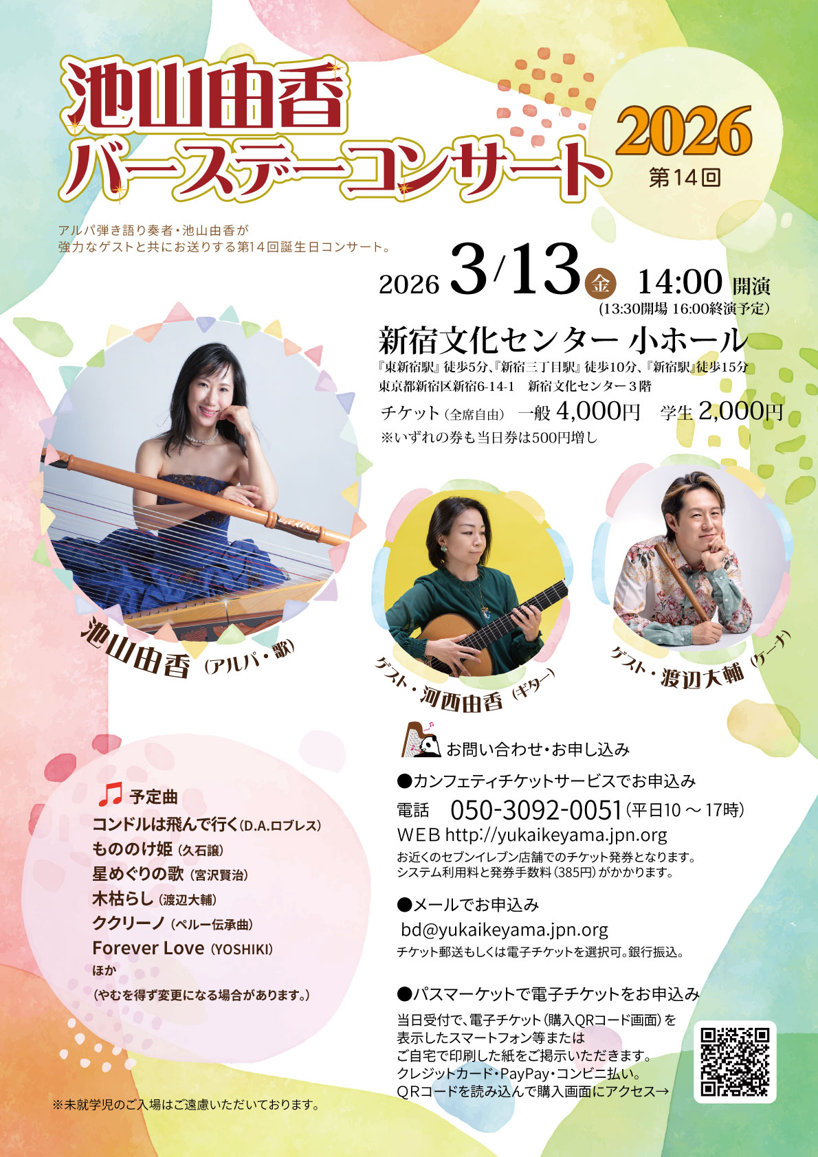 アルパ弾き語り奏者・池山由香が強力なゲストと共にお送りする第14回誕生日コンサート。