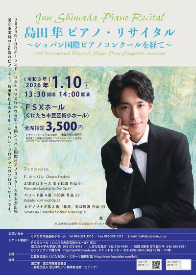 2025年10月ポーランド・ワルシャワで行われる第19回ショパン国際ピアノコンクール本大会出場、国立市出身の20歳のピアニスト・島田隼によるオール・ショパン・プログラムのソロコンサートです。
