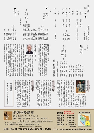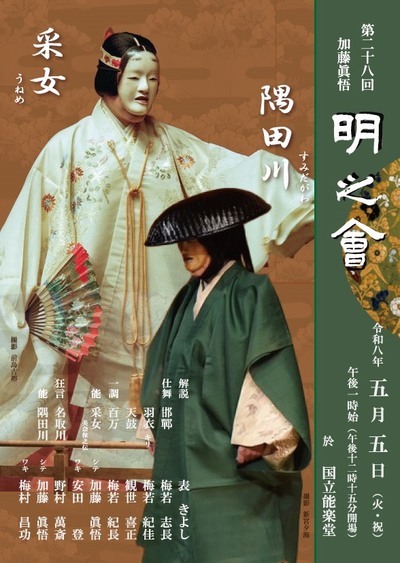 『采女』と『隅田川』にある悲しみから、『名取川』にみる再生の光を感じる一日となりますよう、明之會へお出かけください。