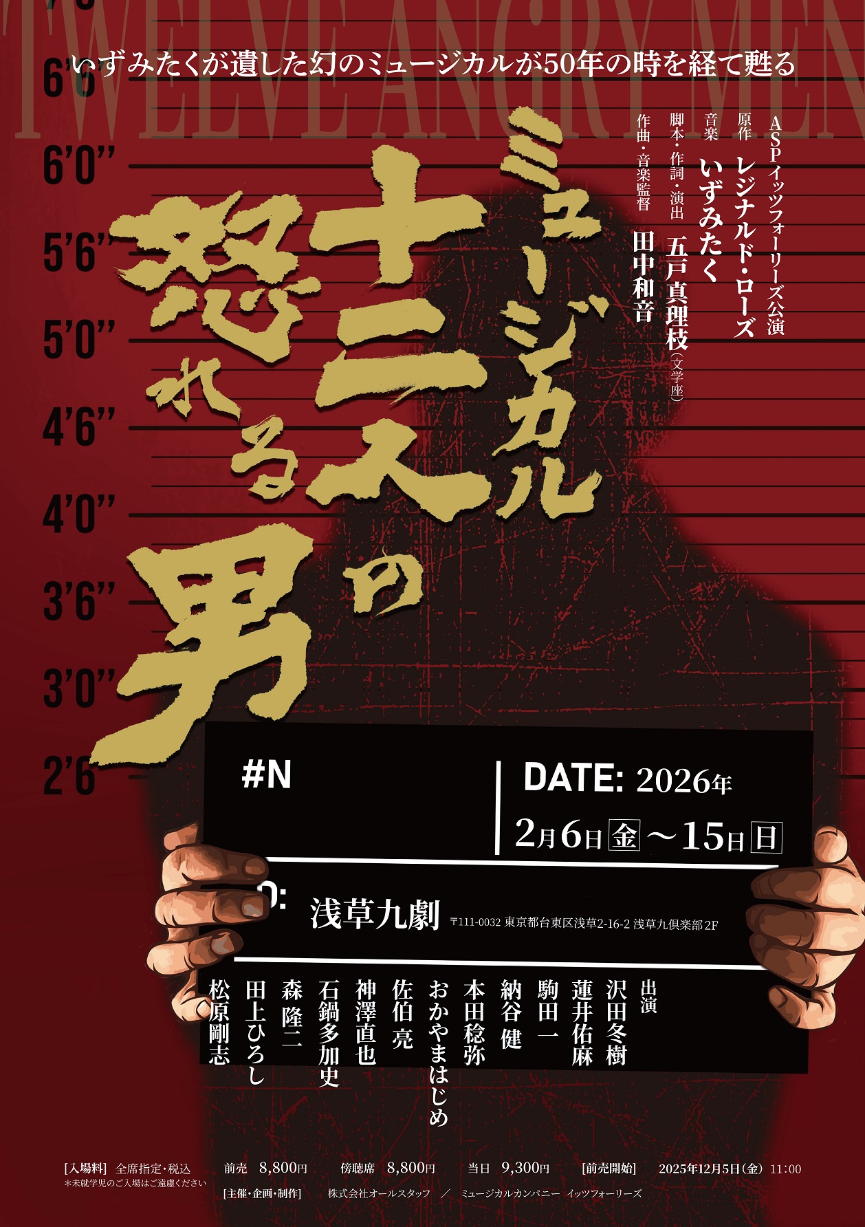 数年前に見つかった「十二人の怒れる男」と書かれた譜面。1970年代に、現在は大学に統合された専門学校のために書かれた譜面であること以外、何も記載されていませんでした。いずみたくが遺したこの譜面をミュージカルとして甦らせようと、演出を五戸真理枝に依頼。音楽監督はイッツフォーリーズ作品では「バウムクーヘンとヒロシマ」などを手掛ける田中和音が担当。何度も舞台化、映画化、ドラマ化され続けている不朽の名作「十二人の怒れる男」をイッツフォーリーズがミュージカルとして上演いたします。