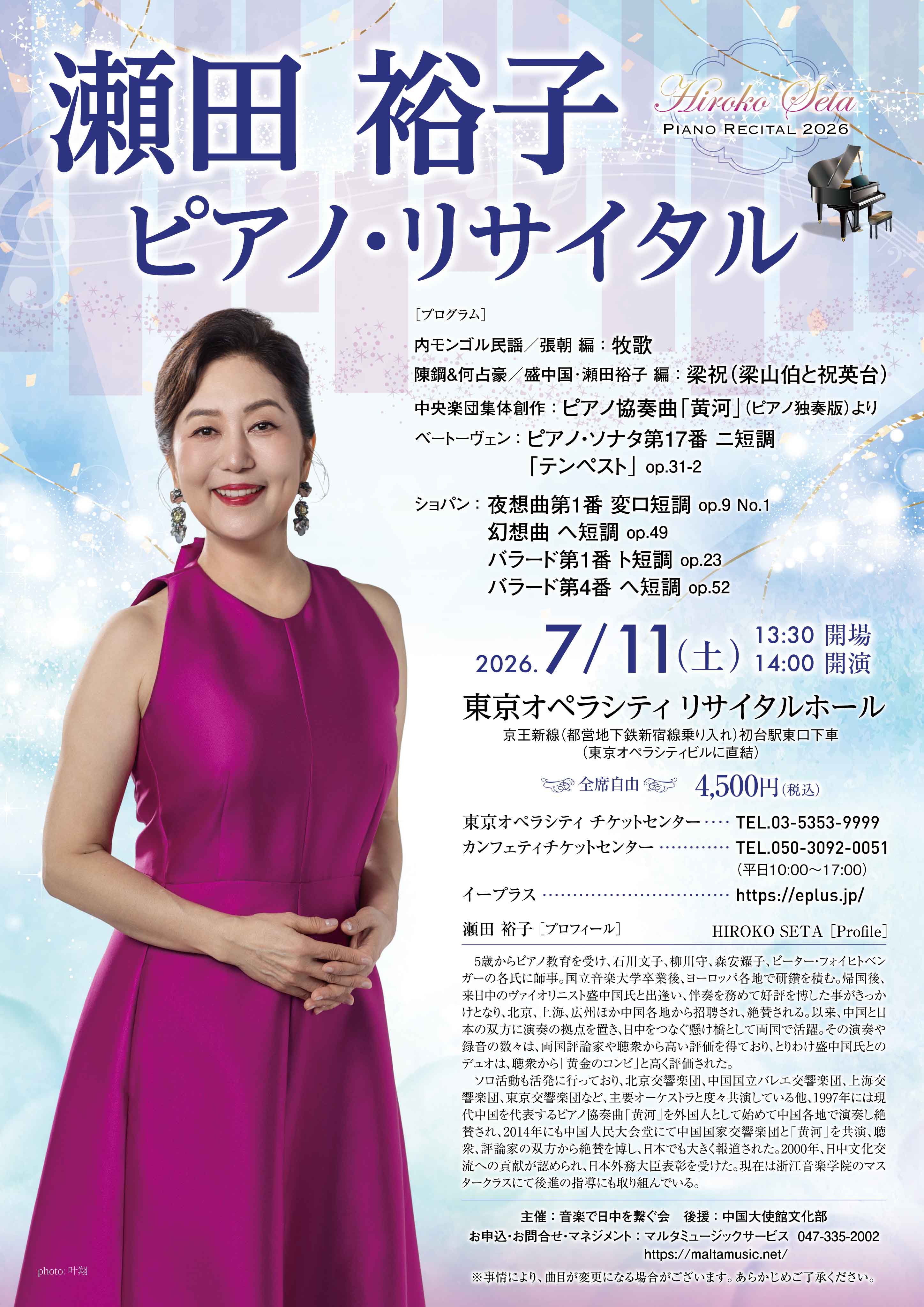 政治的な理由による公演中止を何度も経験しながらも中国全土で公演し、中国の音楽大学でも指導を行う、日本はもとより中国国内で活躍するピアニスト瀬田裕子によるリサイタル。