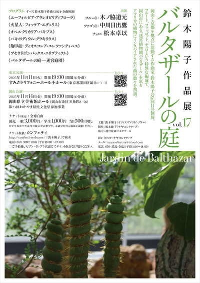 フルート、ファゴット、チェロという特異な編成で、岡山市にある「迷宮植物園バルタザール」を彩るアフリカの植物にインスパイアされた曲の数々を初演。