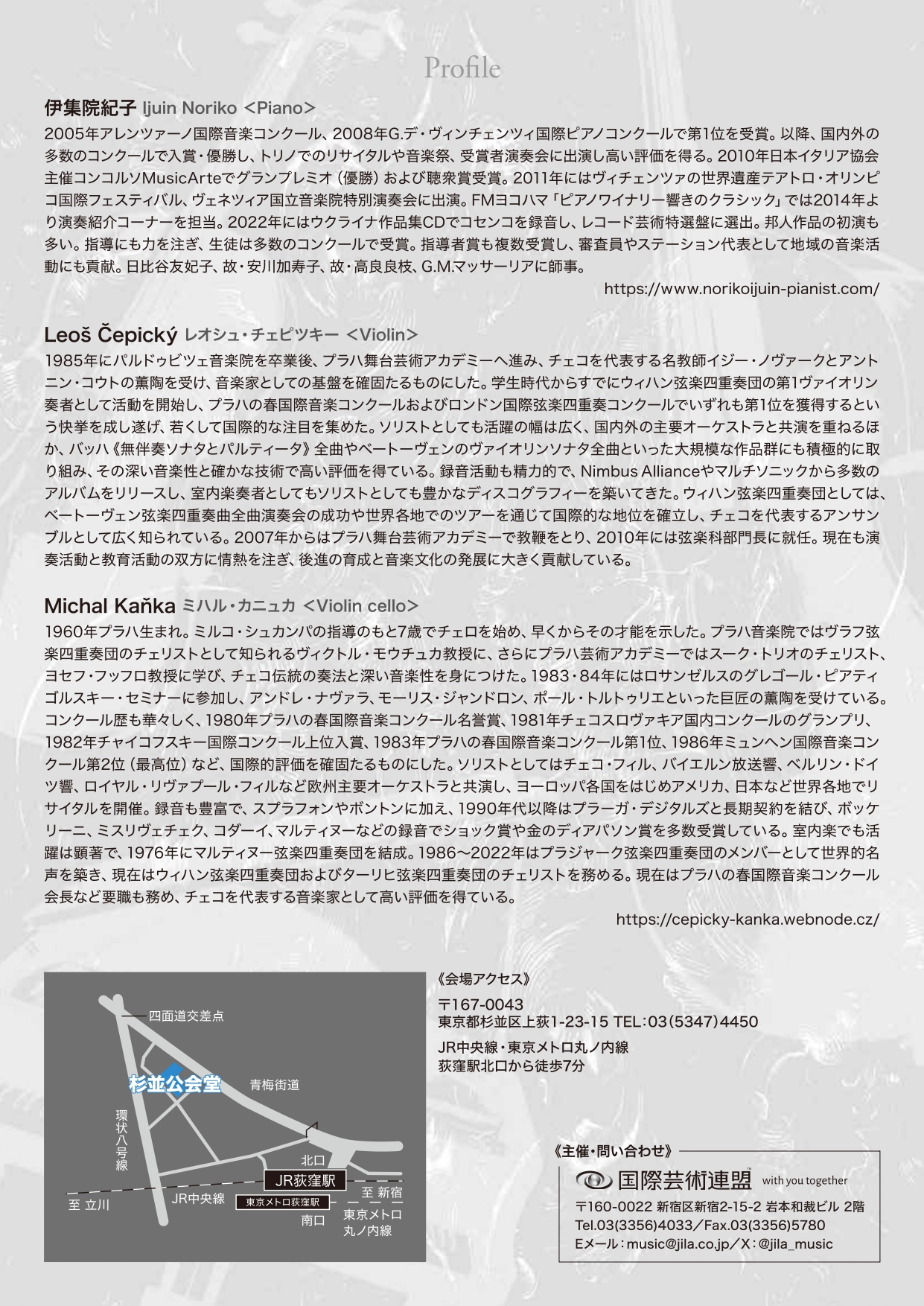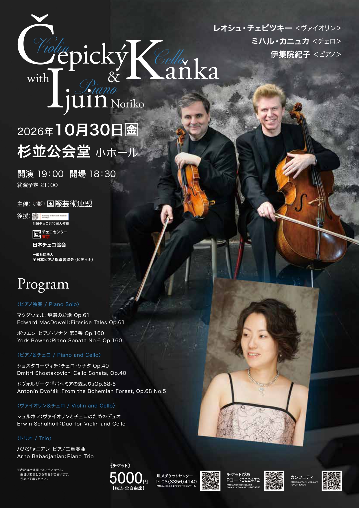 今回、ウィハン弦楽四重奏団の来日ツアー中に、新しいトリオプロジェクトの企画を立ち上げました。レオシュ・チェピツキー(バイオリン)とミハル・カニュカ(チェロ)、伊集院紀子(ピアノ)のトリオで、ピアノソロやチェロ、バイオリンのデュオ、トリオのプログラム等でお楽しみいただけます。