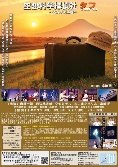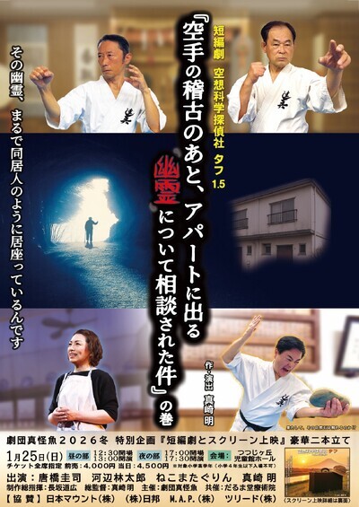 2024年に、5年ぶりの最新作の舞台劇となった『空想科学探偵社タフ~どんぐりの巻』は、多くの観客から、劇団真怪魚始まって以来の最高傑作と絶賛されました。もう一度観たいというファンの熱い要望に応え、CGや音響を駆使して舞台映像を編集し、スクリーンで蘇ることになりました。さらに、その『どんぐりの巻』の続編として、迫力のある空手アクションと、幽霊問題を老探偵タフが解決へと導く短編劇タフ1.5『空手の稽古のあと、幽霊について相談された件』の上演と、豪華二本立てのイベントになります。