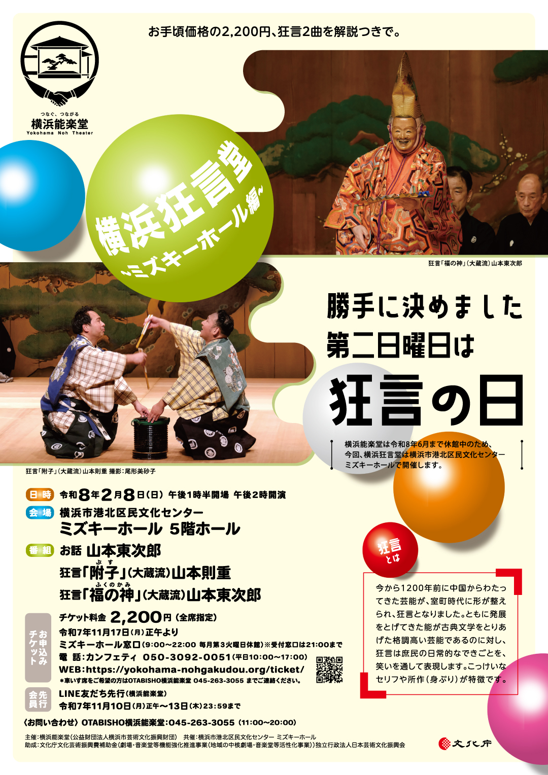 横浜能楽堂は令和8年6月まで休館中のため、今回の横浜狂言堂は横浜市港北区民文化センターミズキーホールで開催します。