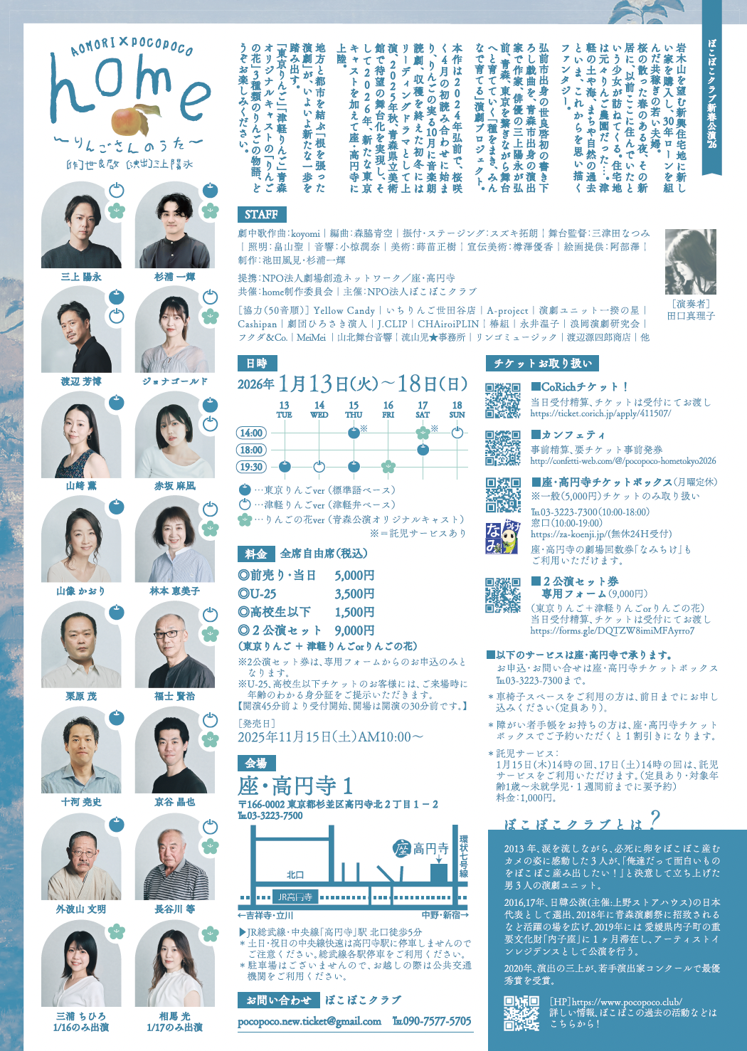 本作は2024年弘前で、桜咲く4月の初読み合わせに始まり、りんごの実る10月に音楽朗読劇、収穫を終えた初冬にはリーディングドラマとして上演、2025年秋、青森県立美術館で待望の舞台化を実現し、そして2026年、新たな東京キャストを加えて座・高円寺に上陸。