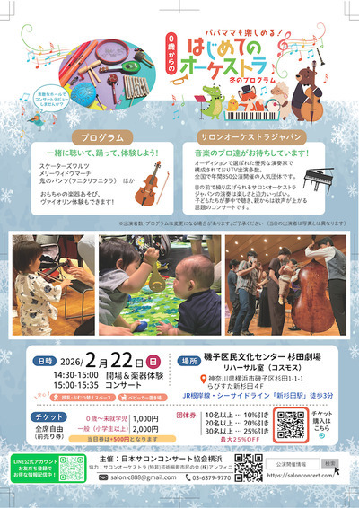 【冬プログラム】ワルツで踊ろう!のコーナーはスケーターズワルツ、鬼のパンツ(フニクリフニクラ)、メリーウィドウマーチ、ほか。冬気分を盛り上げる名曲を次々演奏! 開演前はおもちゃの楽器あそび・ヴァイオリン体験もできます!