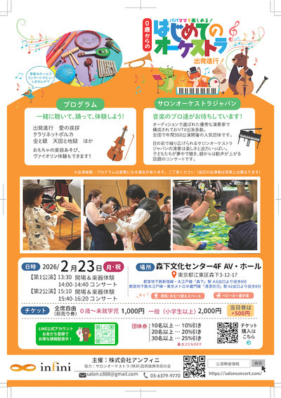 ワルツで踊ろう!のコーナーに、出発進行、愛の挨拶、クラリネットポルカほか。 開場から開演までの間はおもちゃの楽器あそび・ヴァイオリン体験もできます!