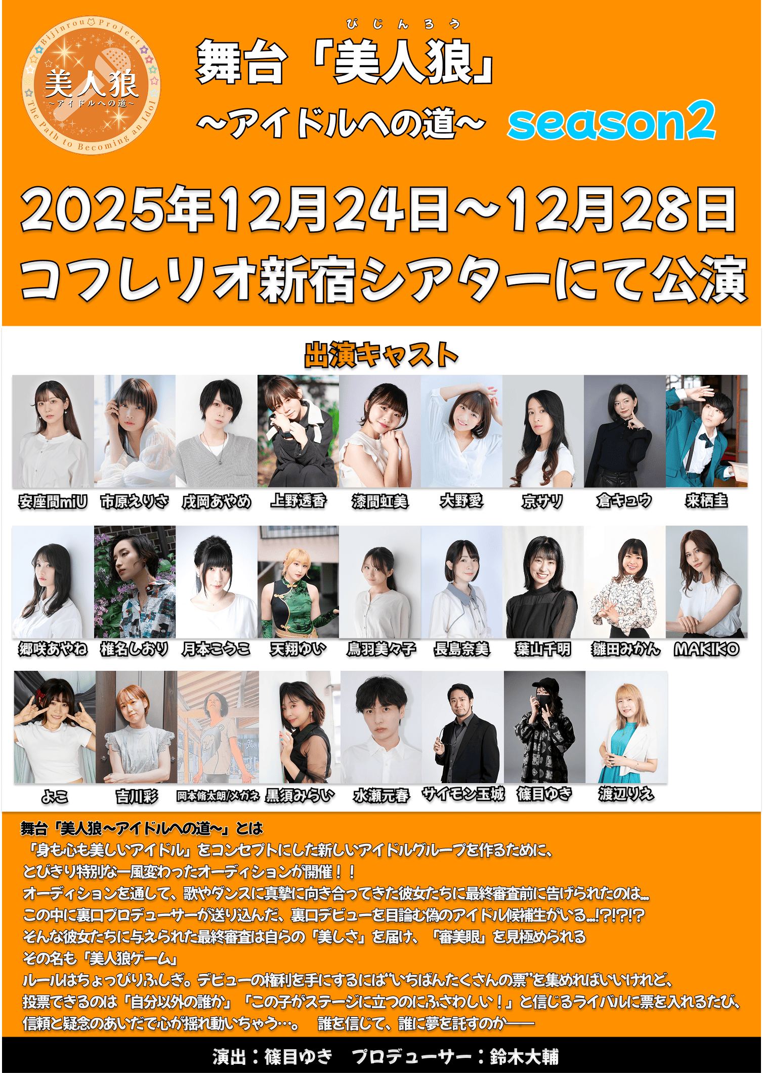 「美人狼」とは―― “身も心も美しいアイドル”をテーマにした、一風変わったオーディション。 最終審査で知らされたのは「この中に裏口デビューを狙う偽の候補生がいる」という衝撃の真実! 投票できるのは自分以外。信頼と疑念が交錯する中、誰を信じ、誰に夢を託すのか――。 観客の拍手で選抜が決まる、かわいくて少しミステリアスなアイドル人狼劇。