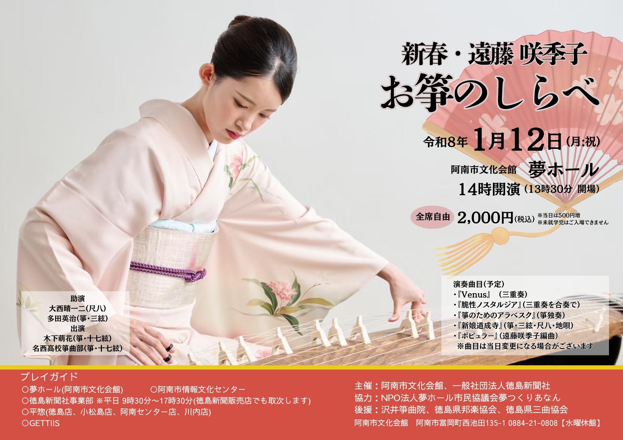 徳島県出身 遠藤咲季子が贈る新春お箏のしらべ。今回はゲストを迎え、箏・尺八・三絃・十七絃・地唄などいろいろな合奏が楽しめる演奏会となっています。