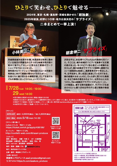 ひとり芝居二本立て ~Solo comedy double bill~ 小林美江「朗独劇」× 朝倉伸二「サプライズ」