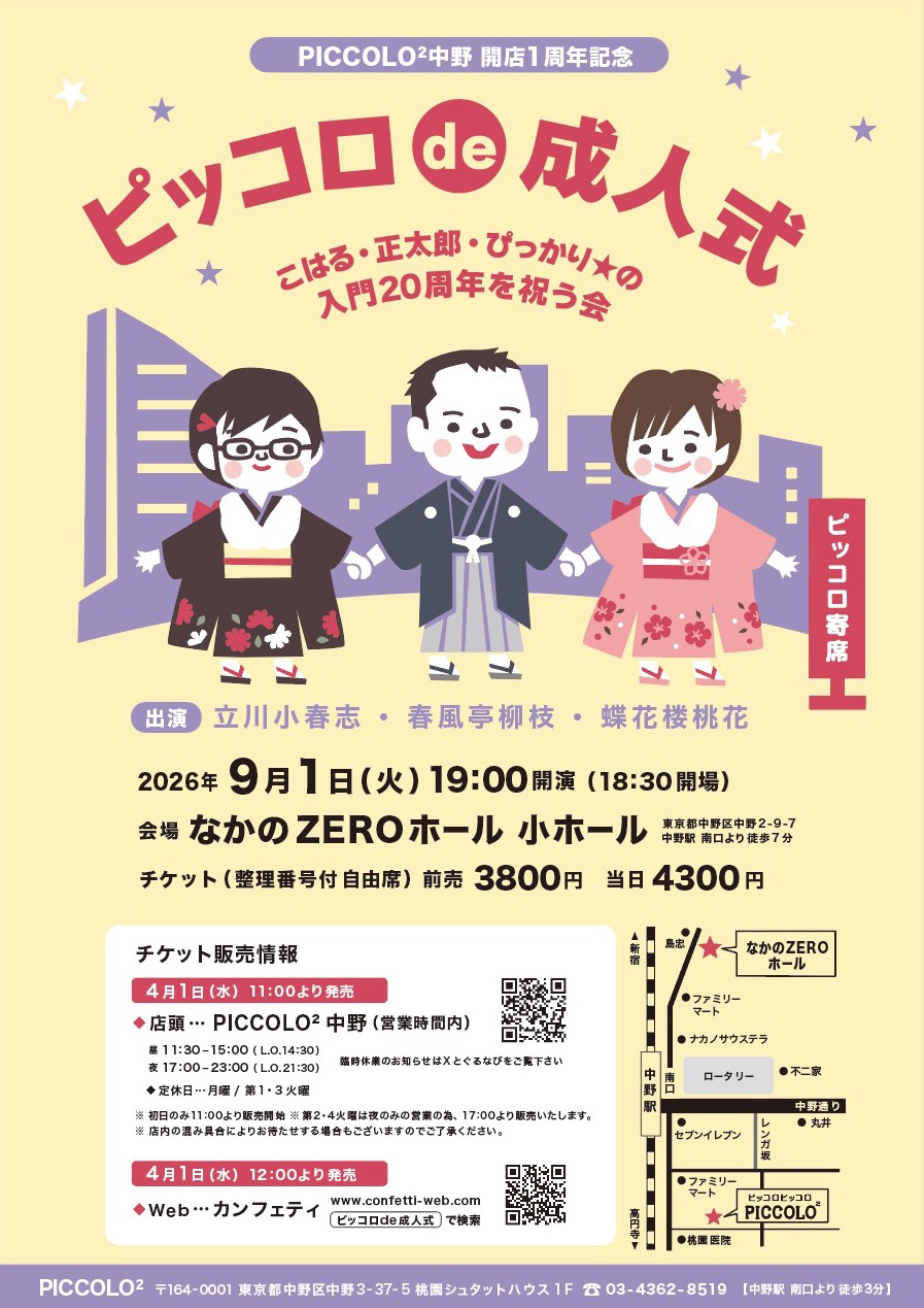 2006年に入門した立川小春志、春風亭柳枝、蝶花楼桃花の三人の芸歴20周年をお祝いする会です。日本橋のピッコロ寄席で二ツ目時代に切磋琢磨したみなさんが立派な真打となって、ピッコロ寄席の特別公演に登場です。