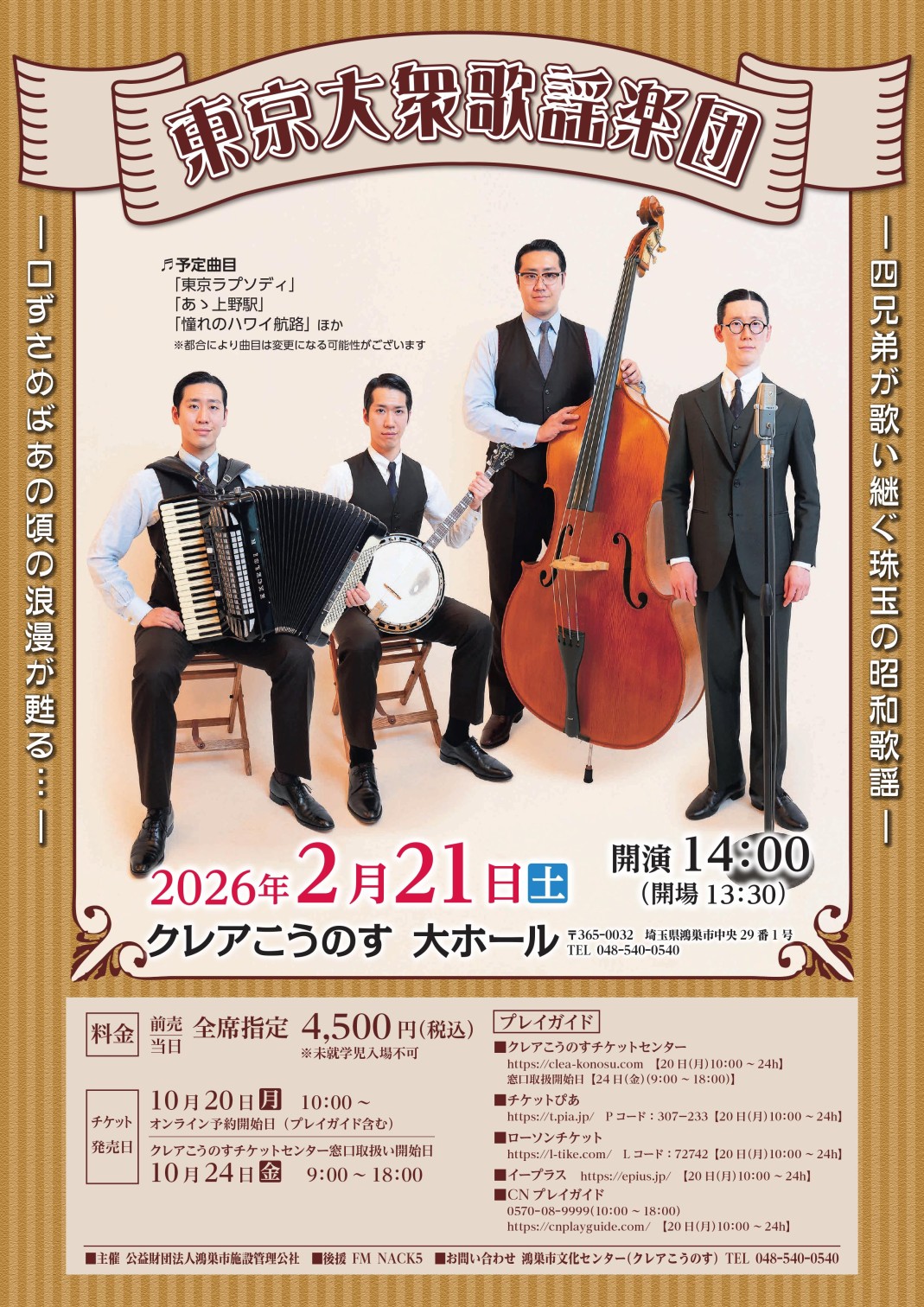 古典歌謡の名曲を歌い継ぐ実の4人兄弟で構成された「東京大衆歌謡楽団」。きっちり決めた昭和スタイルのファッションに身を包み、息の合った演奏で戦前から愛されてきた日本の歌謡曲の数々を歌い上げます。