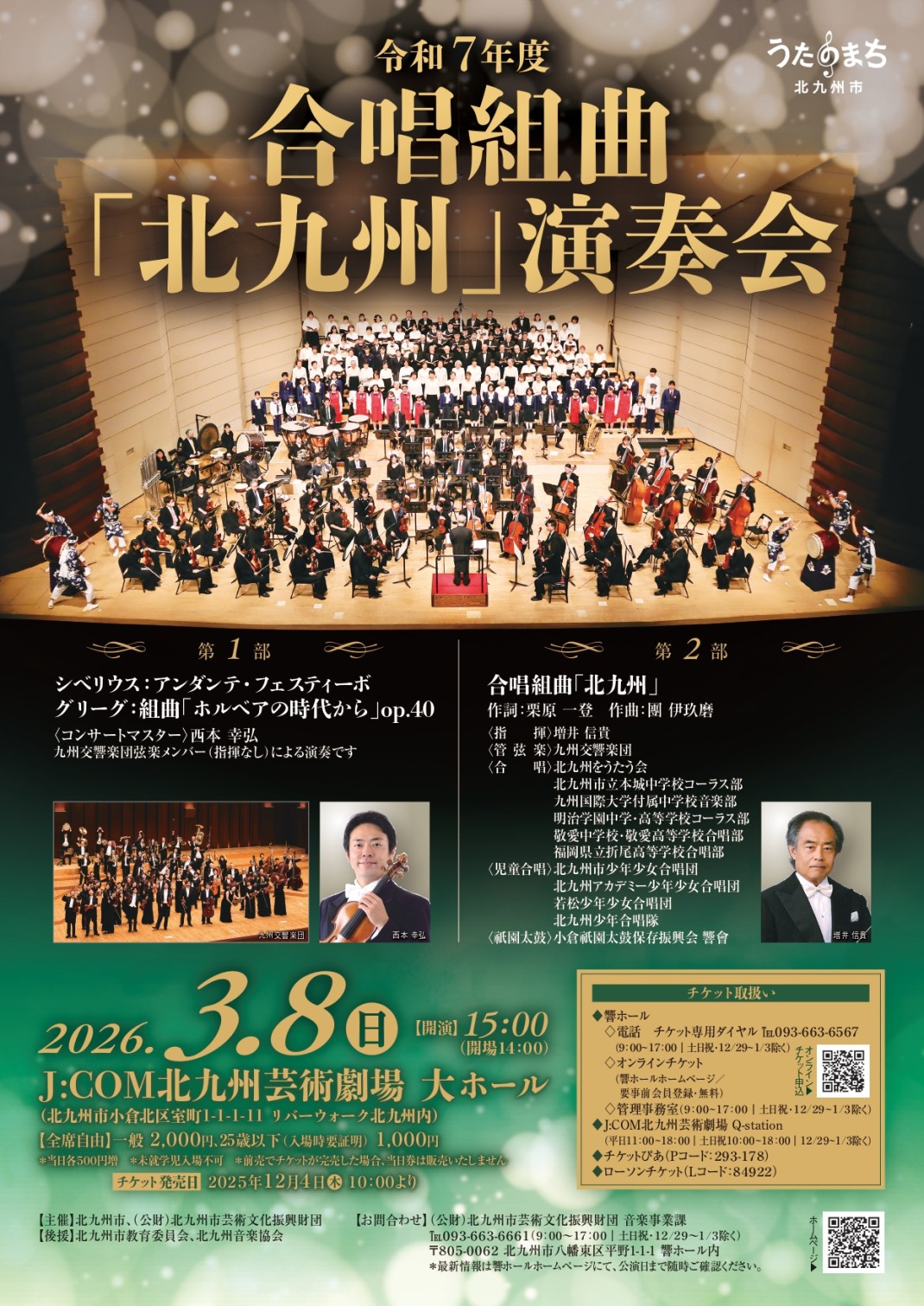 九州交響楽団の管弦楽と170名の市民合唱・小倉祇園太鼓の音色も加わり、総勢250名での合唱組曲「北九州」をお届けします。それぞれの楽章は、方言や太鼓の音色など市内各地域に根付いた特色が色濃く描かれており、地域文化の息吹が感じられる多彩で躍動感のある楽曲です。小学生から80代までの市民が参加し、世代を超えて歌い継がれるハーモニーをどうぞお聴きください!