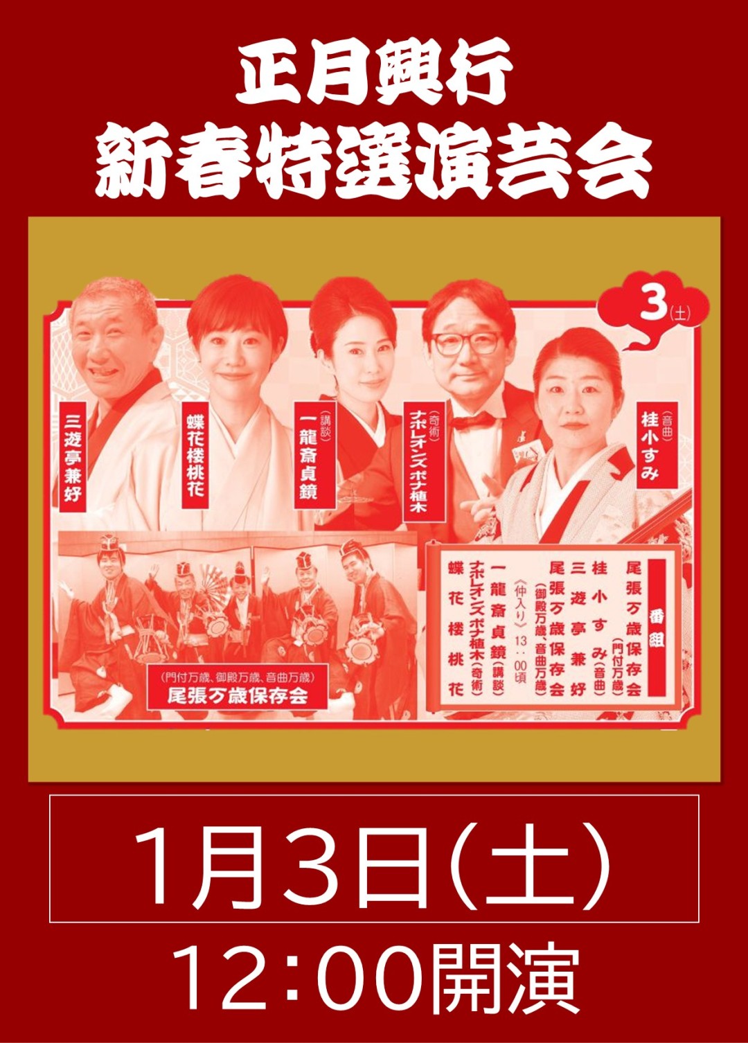 尾張万歳保存会(門付万歳)、桂小すみ(音曲)、三遊亭兼好、尾張万歳保存会(御殿万歳、音曲万歳)《仲入り》一龍斎貞鏡(講談)、ナポレオンズ ボナ植木(奇術)、蝶花楼桃花 ※出演順