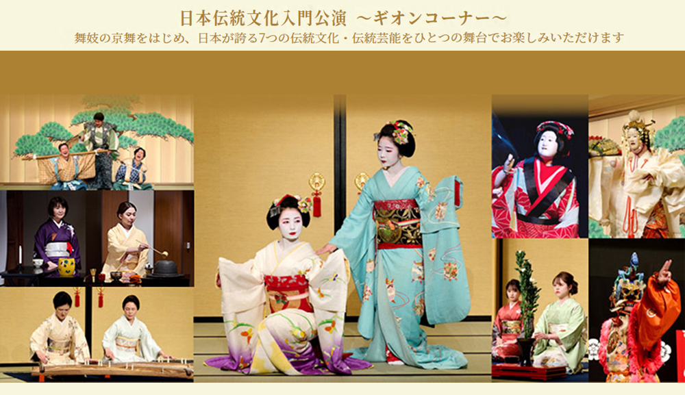 舞妓さんによる京舞をはじめ、茶道、華道、箏曲、舞楽、狂言、文楽または能の7つの伝統文化や伝統芸能をおよそ1時間で鑑賞できるスポットです。