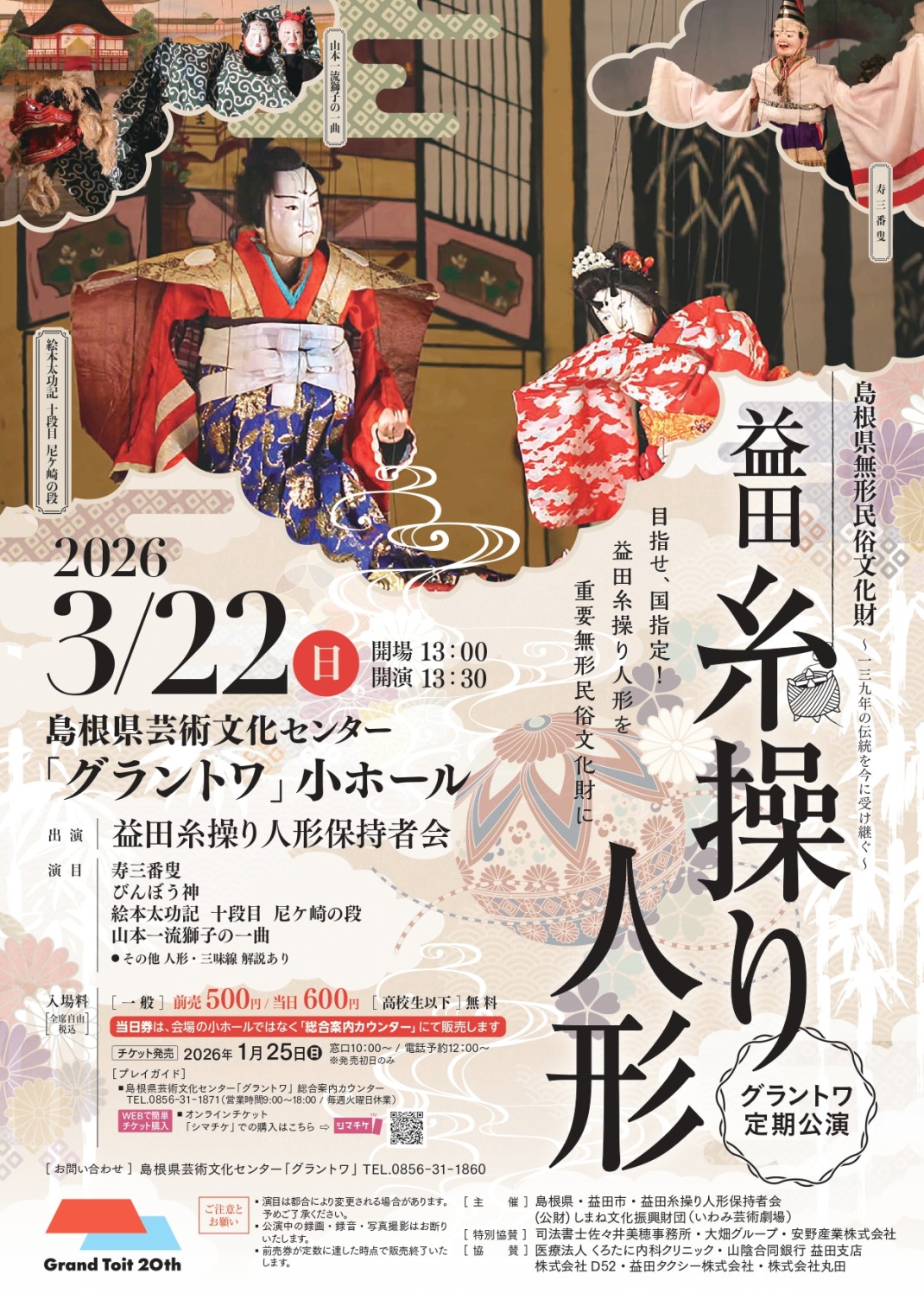 明治時代に益田の地に伝わり、139年間その伝統を受け継いできた島根県無形民俗文化財「益田糸操り人形」のグラントワ定期公演です。