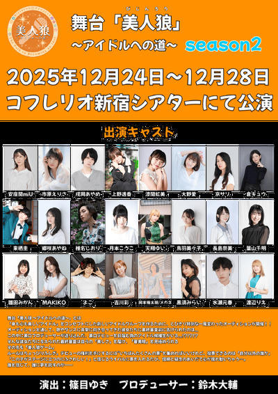 舞台「美人狼~アイドルへの道~」は、アイドル候補生たちが“選抜”を目指し、熱い議論と駆け引きを繰り広げる観客参加型の人狼系舞台です。全員が当選候補者となり、仲間か敵か分からない中で協力と裏切りを重ねながら、自らの存在を証明していきます。緊張感と臨場感あふれる物語が、観客を没入させるライブエンターテインメントです。