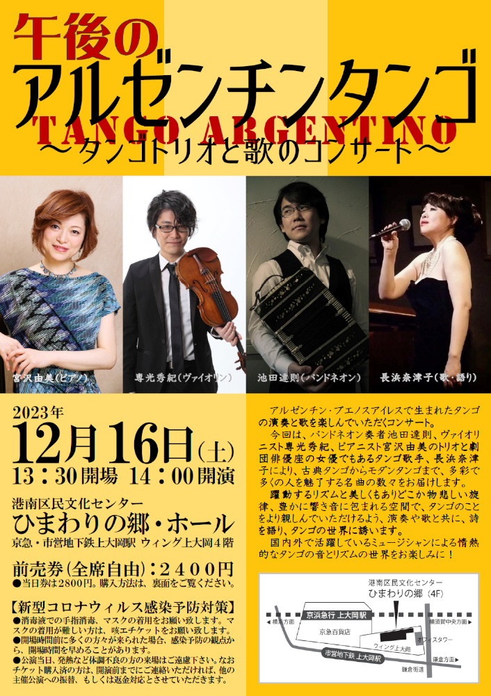 【出演者】 池田達則(バンドネオン)、専光秀紀(ヴァイオリン)、宮沢由美(ピアノ)、長浜奈津子(歌・語り)