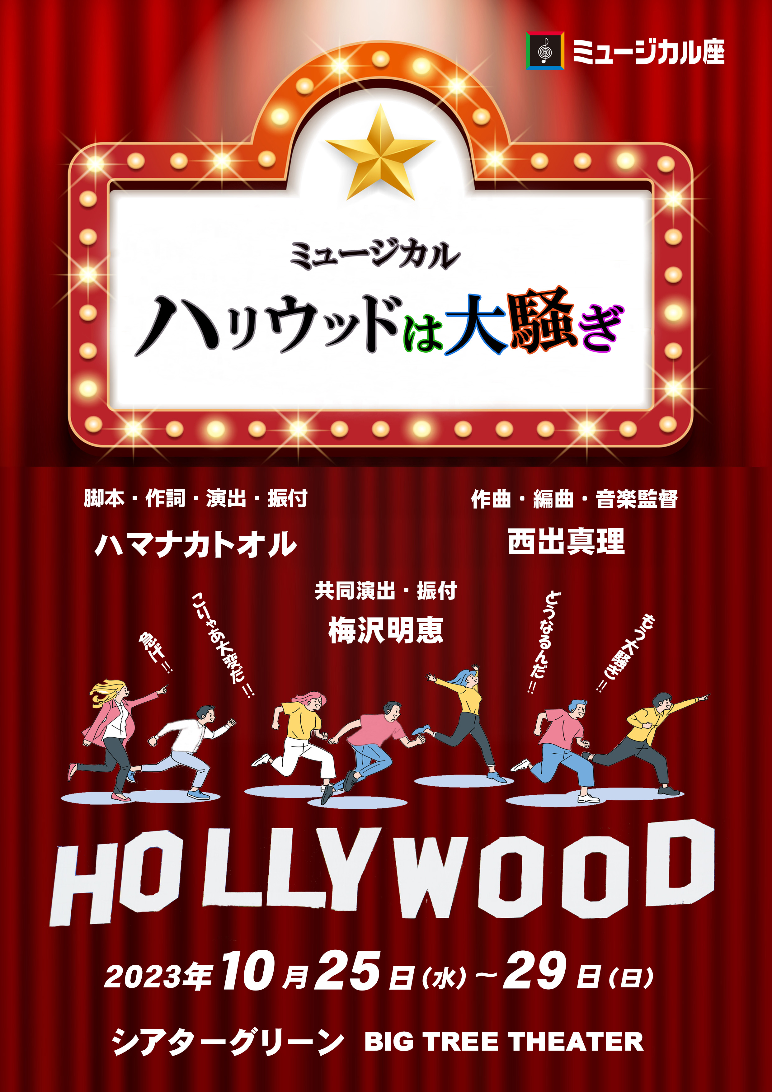 ミュージカル座10月公演は、ハマナカトオルの新作ミュージカル。ハリウッドで起こった有名映画スターの離婚裁判は、妻の暴露によって大スターの夫の信じられない素顔が次々と明らかになり、映画関係者、ファンを巻き込んでハリウッドは大騒ぎとなる。果たして、この夫婦の行方は!?