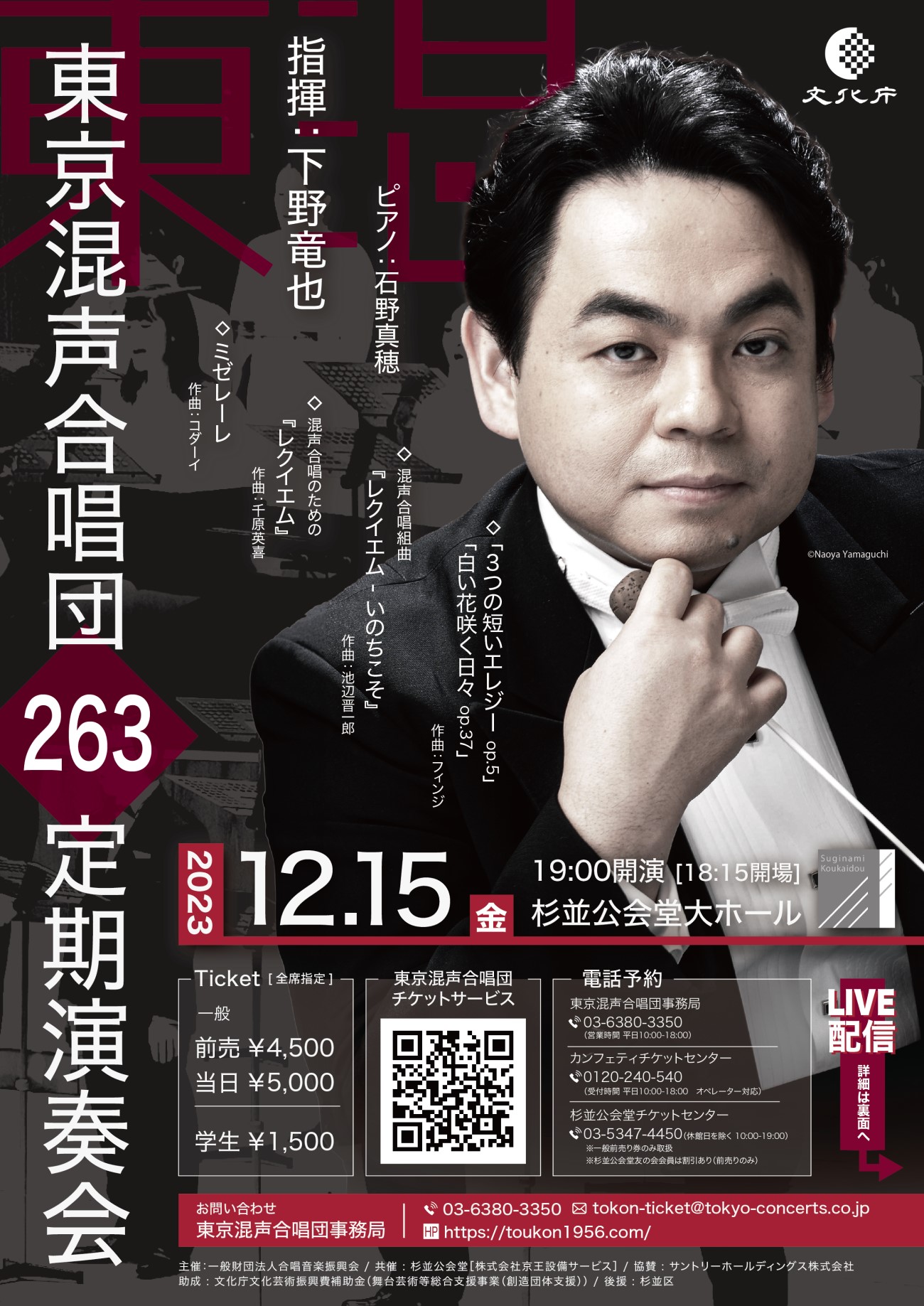 ミゼレーレ 作曲:コダーイ / 混声合唱のための「レクイエム」 作曲:千原英喜 / 混声合唱組曲「レクイエム いのちこそ」 作曲:池辺晋一郎 / 「3つの短いエレジーop.5」「白い花咲く日々op.37」 作曲:フィンジ