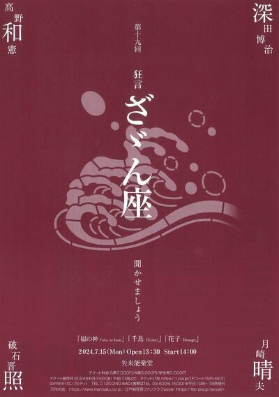 狂言「福の神」出演:野村万作・野村裕基・中村修一 / 狂言「千鳥」 出演:月崎晴夫・竹山悠樹・破石晋照 / 狂言「花子」 出演:高野和憲・野村萬斎・深田博治