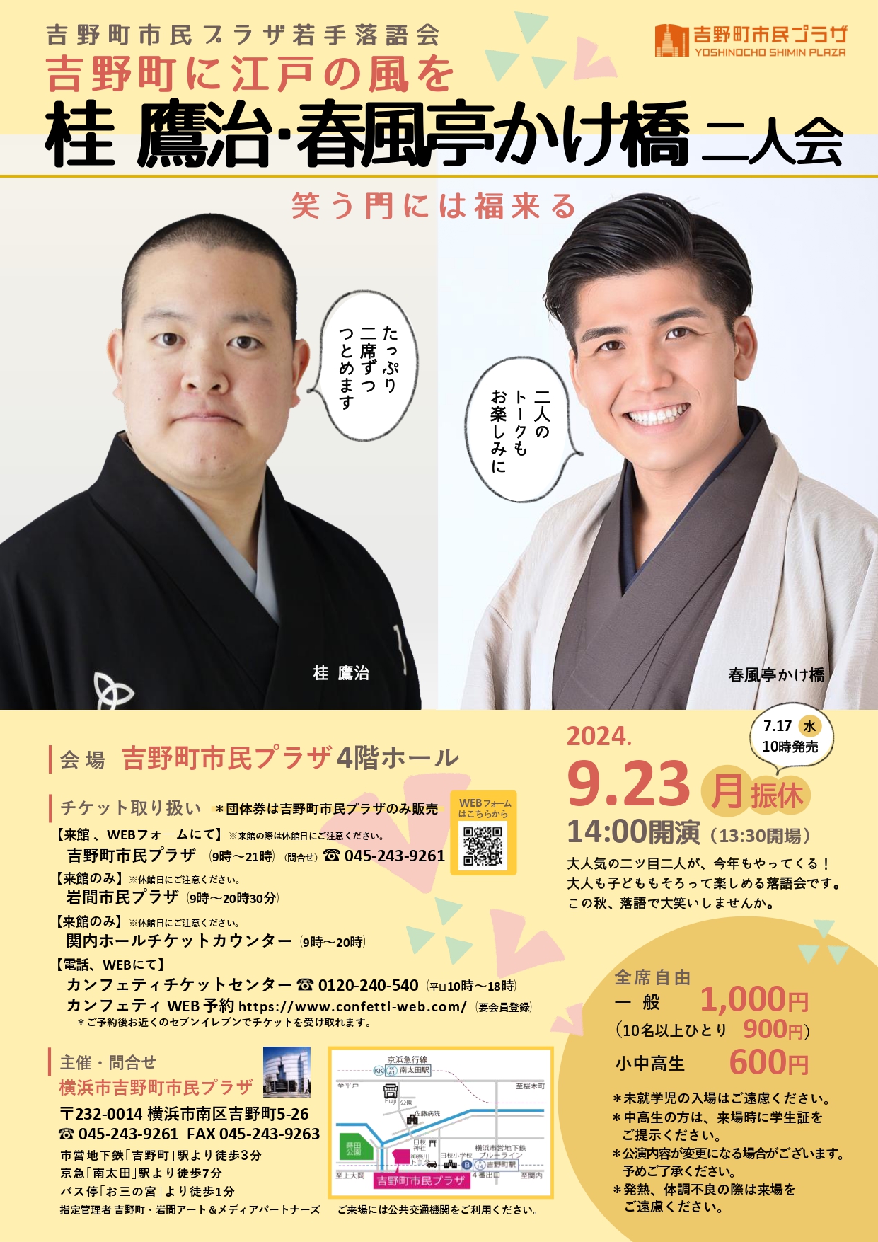 大人気の二ツ目、桂 鷹治と春風亭かけ橋が今年もやってくる! 大人も子どももそろって楽しめる落語会です。 たっぷり二席ずつつとめます。二人のトークコーナーも。 この秋、落語で大笑いしませんか。