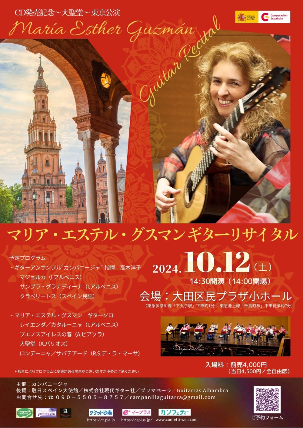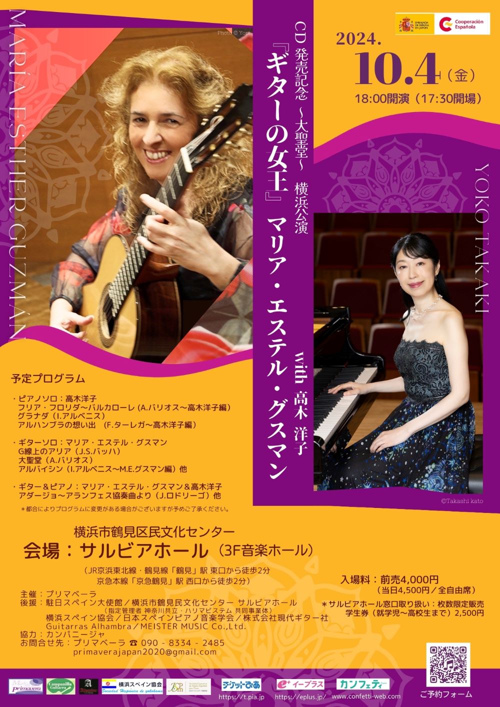 クラシックギタリスト、マリア・エステル・グスマンはスペイン・セビーリャ生まれ、4歳で同地のロペ・デ・ベガ劇場でデビュー。11歳でスペイン国営放送局主催の音楽コンクールで優勝し、12歳の時に巨匠アンドレス・セゴビアにその演奏を讃えられた。 「ギターの女王」と称され、スペインに留まらず世界各地で幅広く活躍している。 今回のNewCD「大聖堂」発売記念コンサート、横浜公演ではソロの他にも、高木洋子(ピアノ)とのアランフェス協奏曲など、バラエティに富んだプログラムを聴かせる。