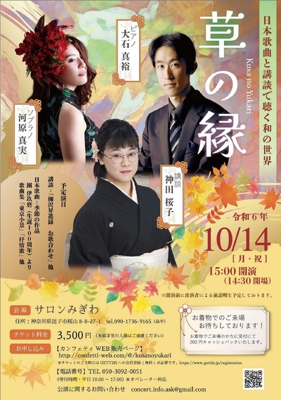 「美しい日本語に触れる」をテーマに、日本歌曲と講談からその世界観を体感するプログラムを展開いたします。 歌曲は季節の感じさせるものや、今年で生誕100年を迎える團 伊玖磨の作品を、講談からは古典から2作品を取り扱う予定です。 滅多に組み合わされることのない日本歌曲と講談という珍しい並びのプログラムを、是非お聴きいただければ幸いです。