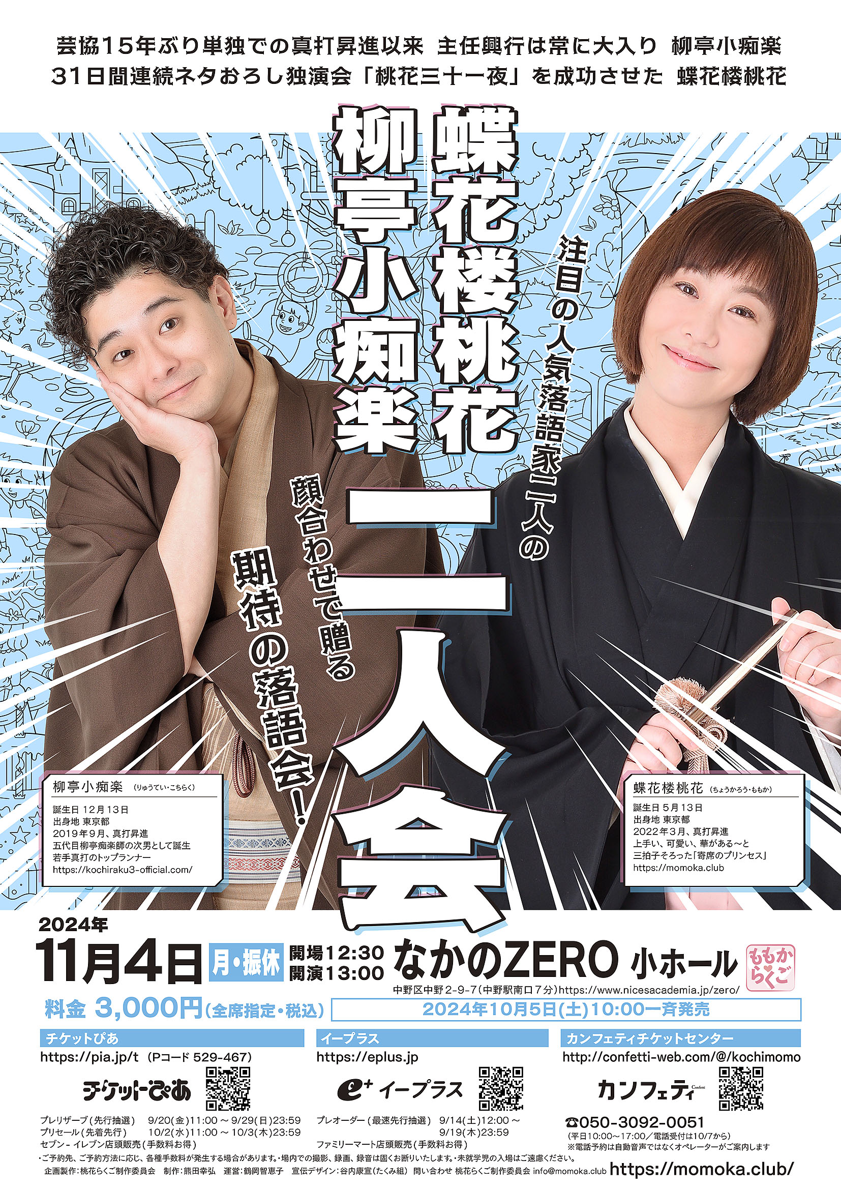 芸協15年ぶり単独での真打昇進以来 主任興行は常に大入り 柳亭小痴楽。 31日間連続ネタおろし独演会「桃花三十一夜」を成功させた 蝶花楼桃花 。 注目の人気落語家二人の顔合わせで贈る、期待の落語会!