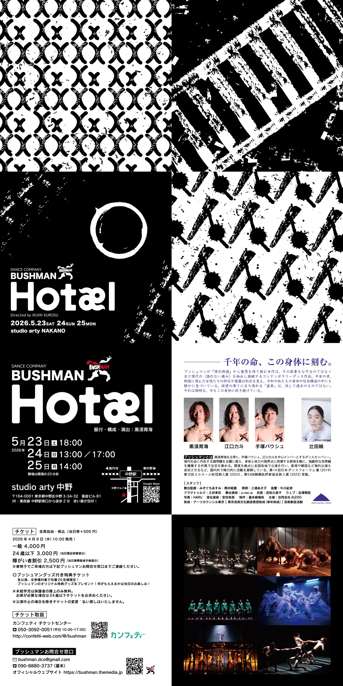 『源氏物語』をモチーフに、女性たちの沈黙、痛み、そして光源氏の虚無を、ブッシュマンのメンバーとゲストに辻田暁を招き、語ることのできなかった声を、身体が立ち上げる。平安の美の奥に潜む抑圧と欲望を、血と汗と土の匂いのするノンバーバルな身体表現で現代に問い直す。