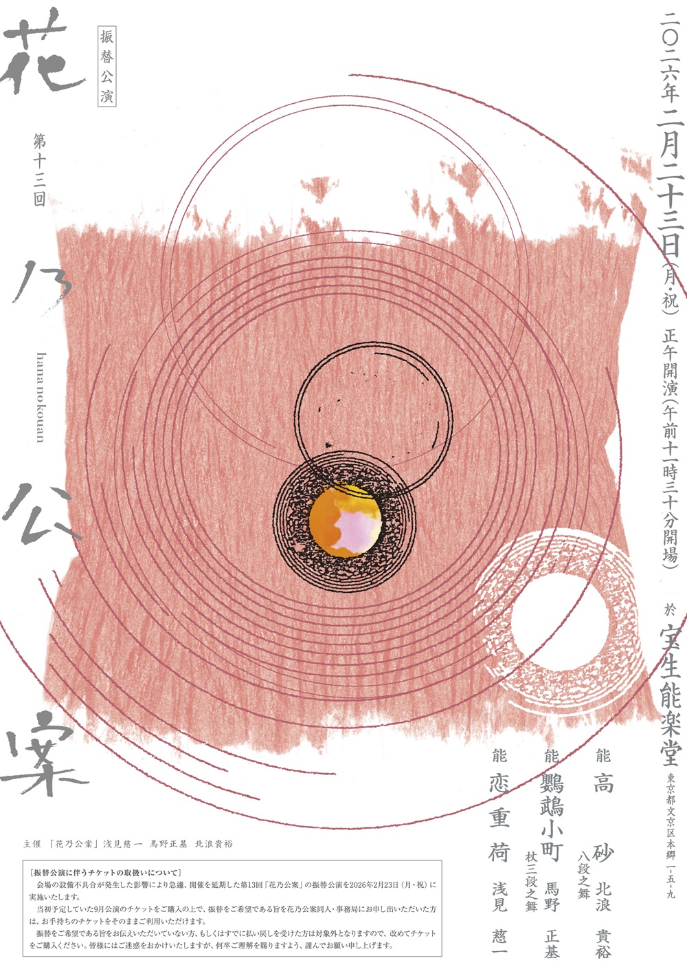 因場地設備故障而臨時延期的第 13 屆「花之公案」演出將改為改期至2026年23日(國定月)。